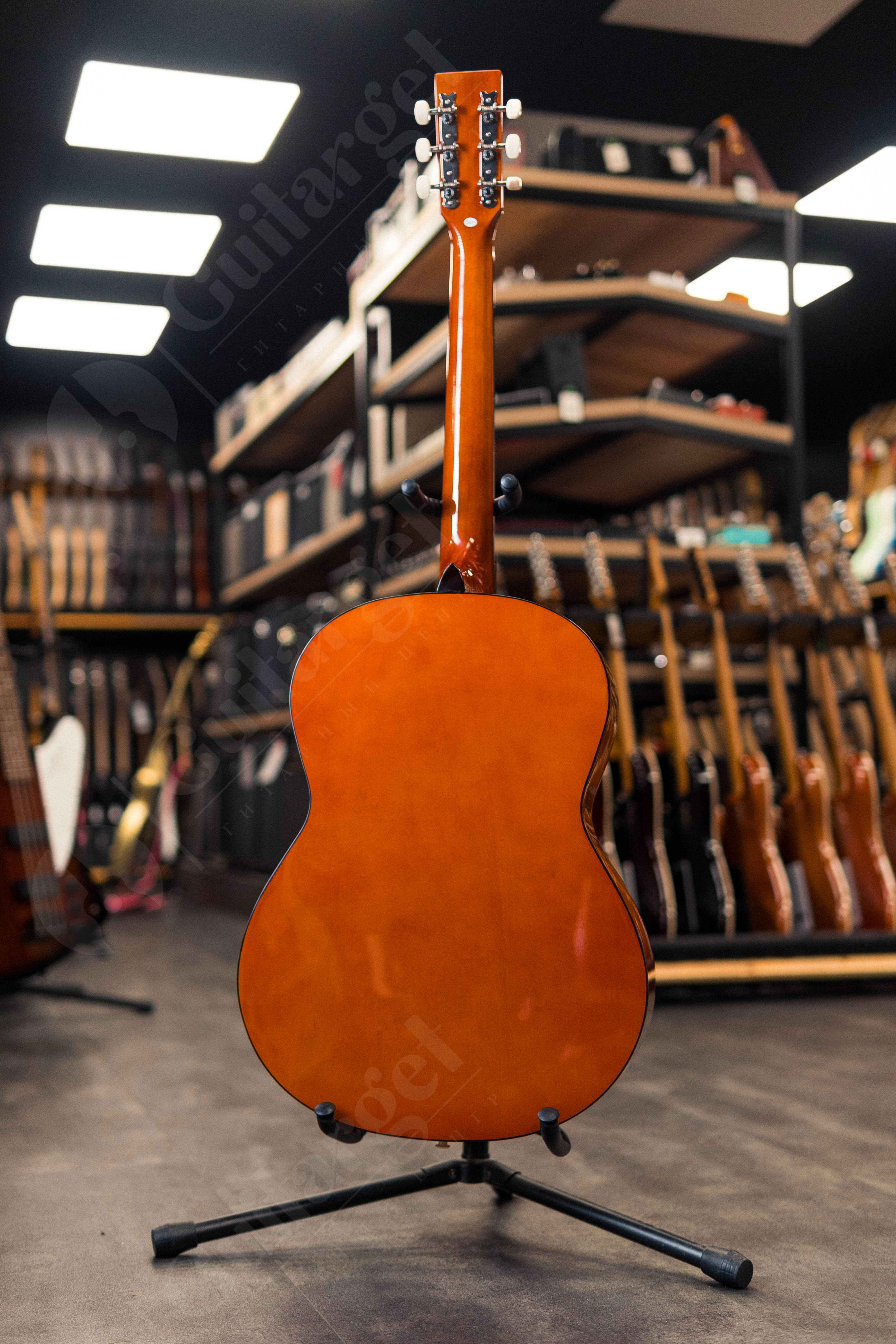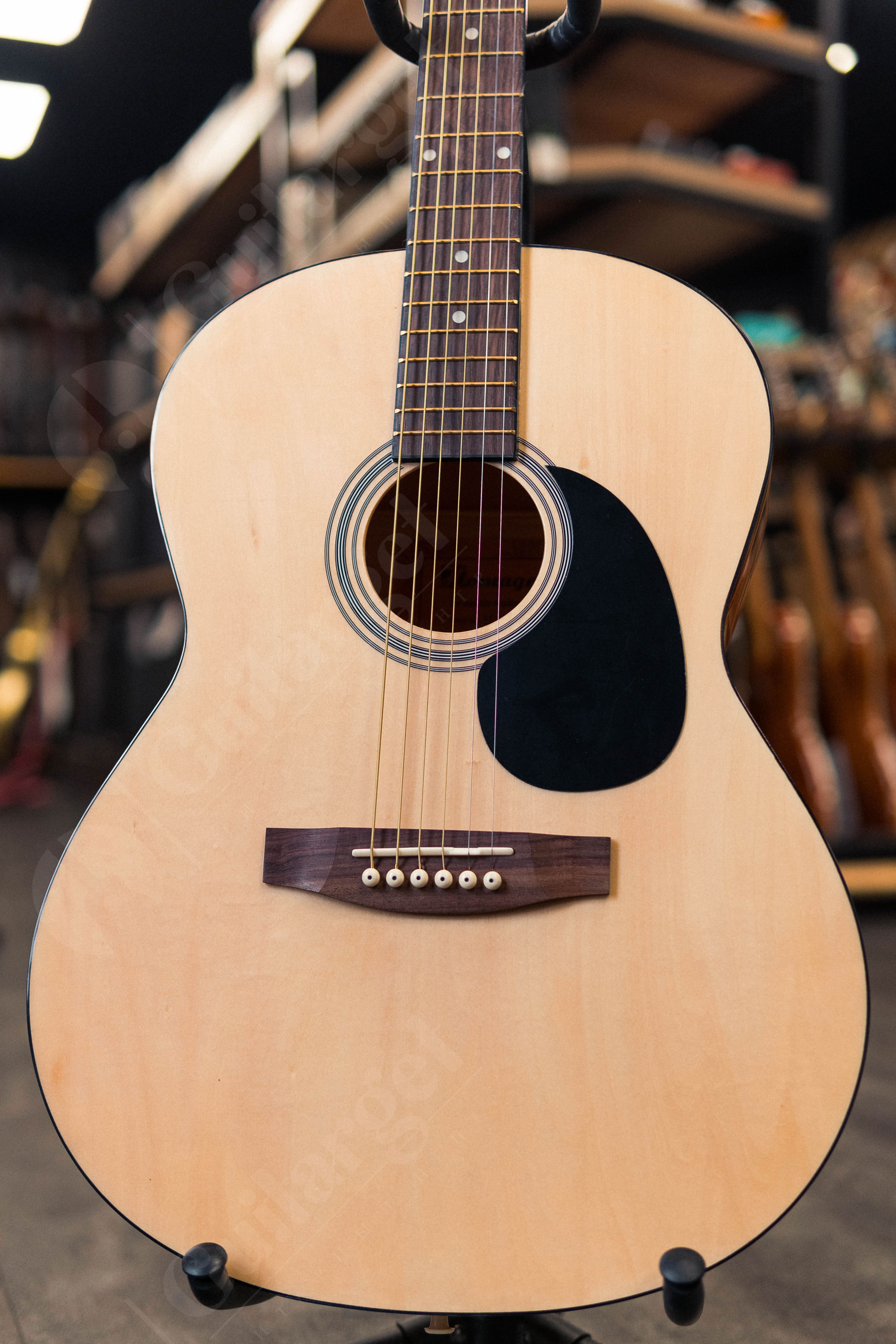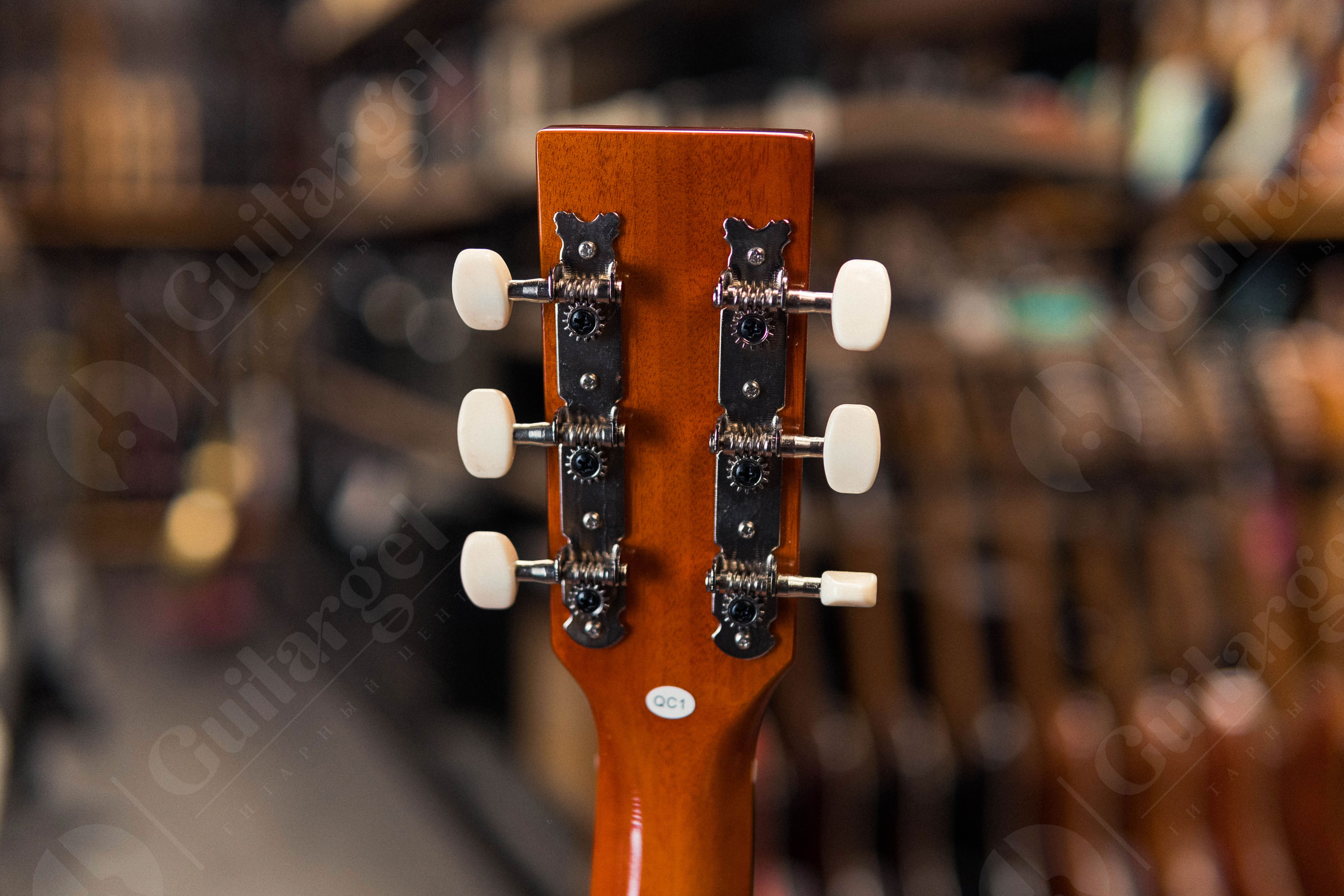 Хромированная колковая механика обеспечивает точную настройку и стабильность строя, а чёрная окантовка по деке подчёркивает классический стиль инструмента.