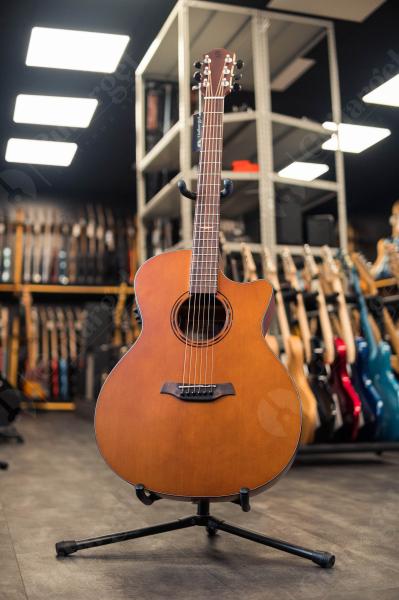 У нее прочная верхняя дека из канадского кедра с нижней декой и боковыми сторонами из красного дерева. Гриф также выполнен из красного дерева, а накладка и бридж – из древесины ованкола. У гитары 20 ладов, верхний и нижний порожек выполнены из материала NuBone: это разновидность запатентованного материала TUSQ от GraphTech, у него похожие тональные характеристики: он не гасит вибрацию струн и передает оптимальные частоты для гитары, позволяя иметь большие объем и тон, а также больше гармоник. Ширина верхнего порожка составляет 43 мм. Окантовка– ABS, черного цвета. Используются струны Elixir, мензура средней длины – 650 мм. Колки – литые матовые хромированные с черными кнопками.