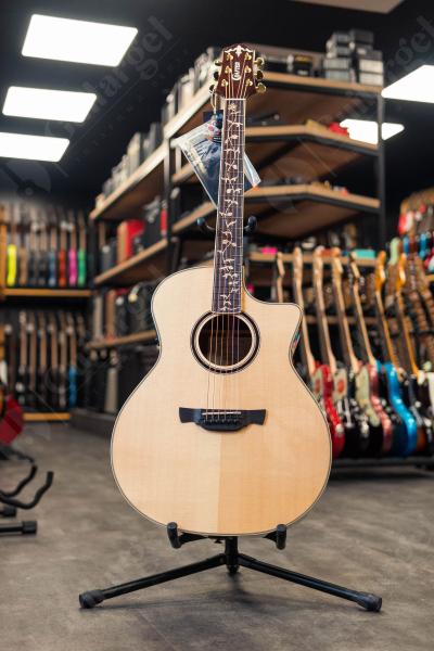 Чистое и яркое звучание обеспечивает верхняя дека из массива ели, а корпус из экзотического макассара подчеркивает эти характеристики, добавляя мощность и выделяя средние частоты, что делает инструмент универсальным для многих стилей игры.