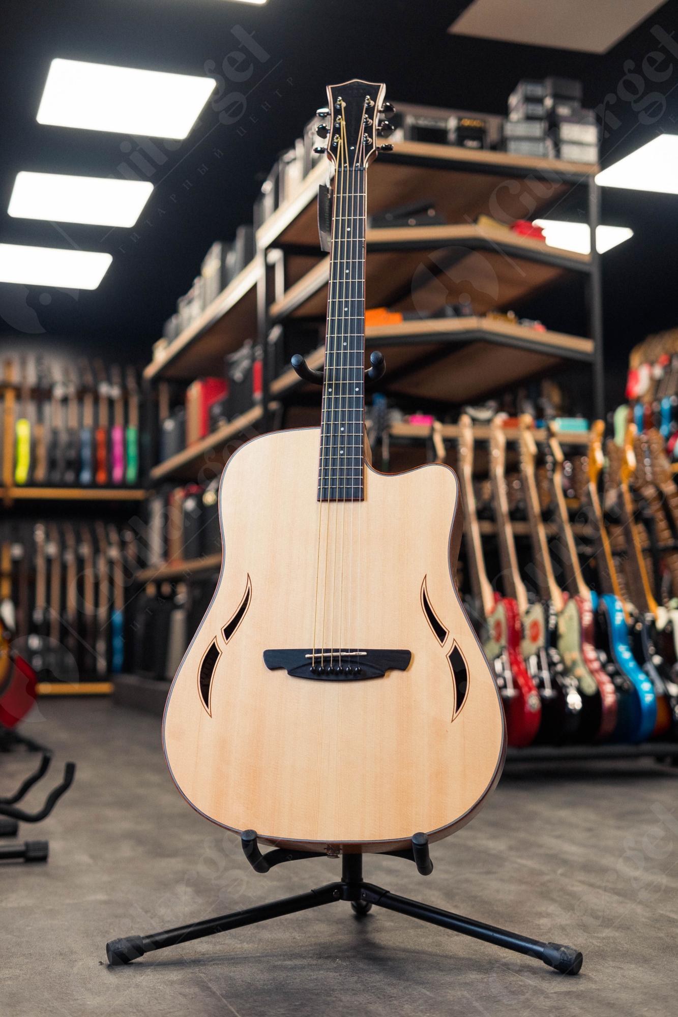 SQOE SQ-F - это популярная электроакустическая гитара с формой Drednought (дредноут) с нестандартными вырезами розеток, у которой дека имеет увеличенный размер. Благодаря этому звучание инструмента более объемное, глубокое и мощное, где явно слышимые средние и низкие частоты придают звуку бархатистость и сочность.