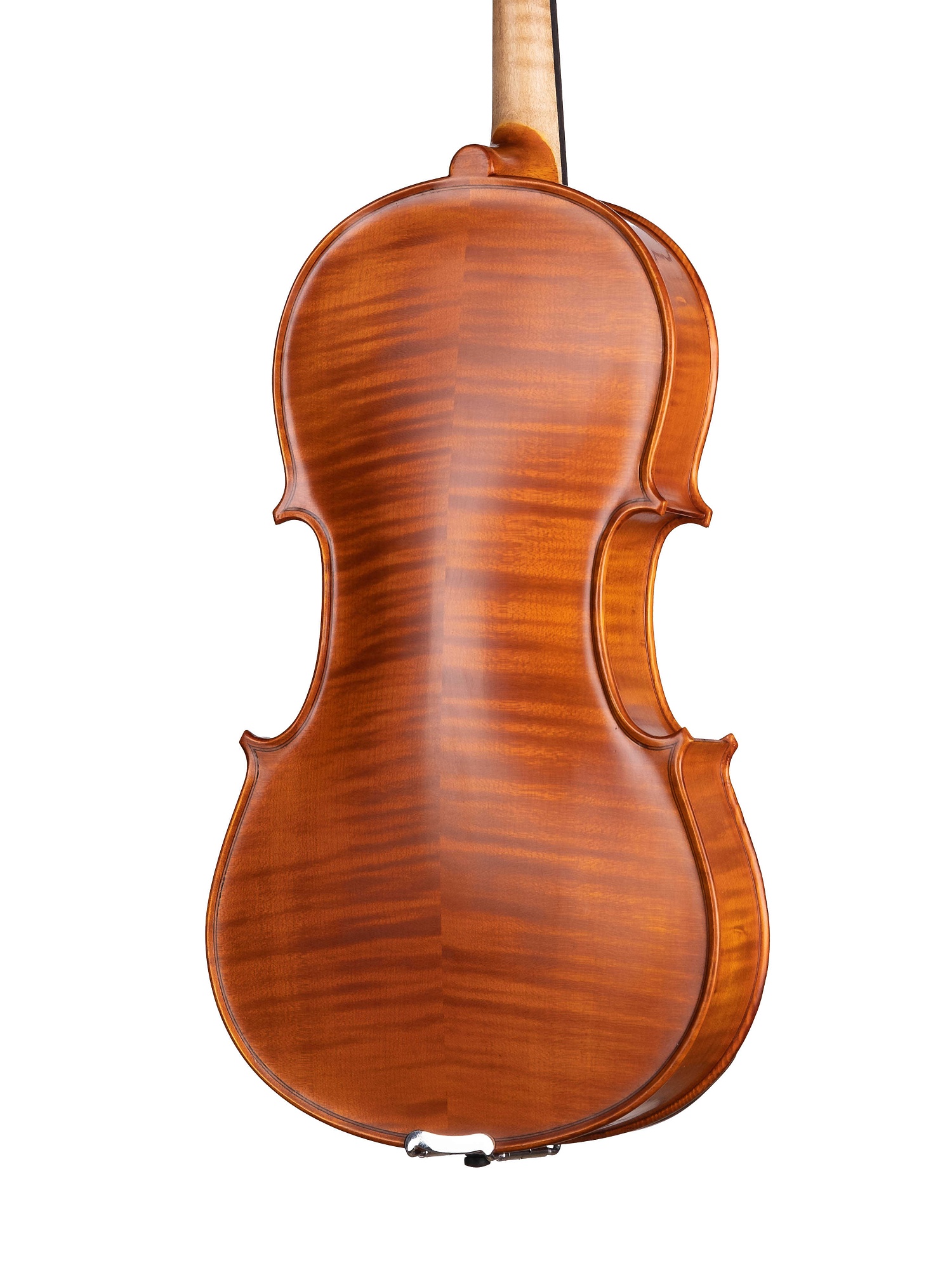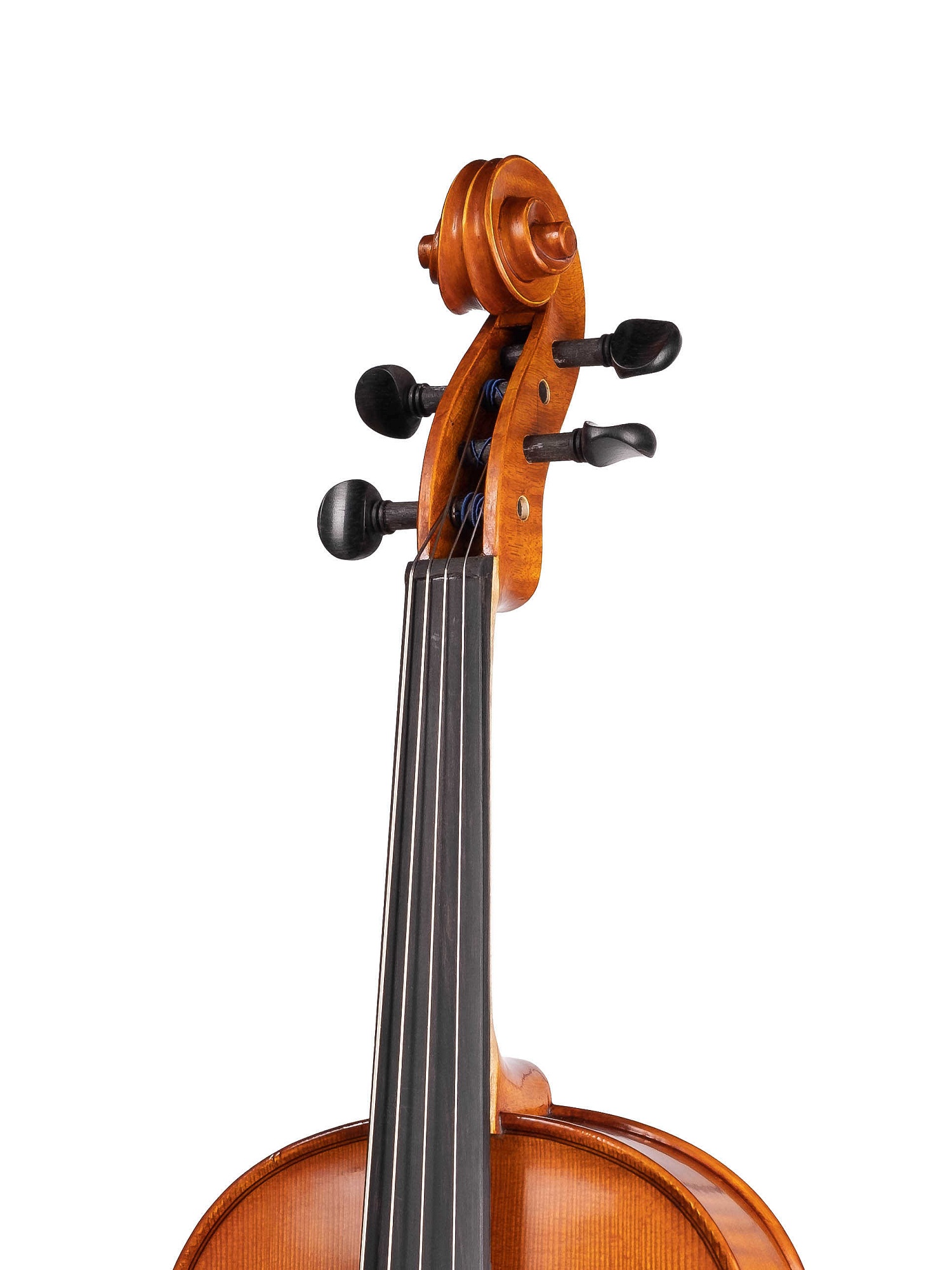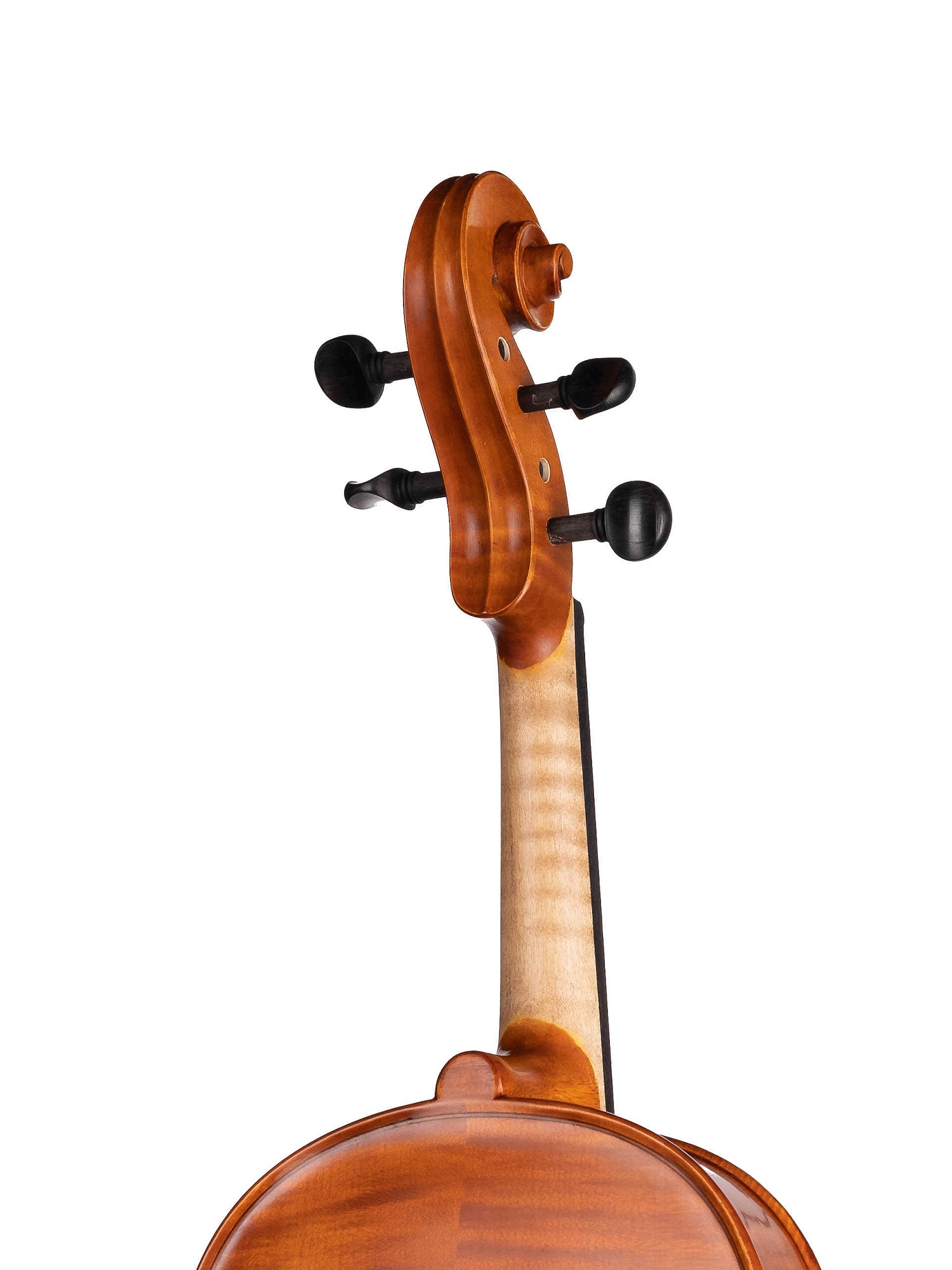 Изготовленный вручную инструмент с верхней декой из массива ели, кленовой задней декой и обечайками и деревянным кантом. Колки, накладка грифа, подбородник и струнодержатель из черного дерева. Инструмент вручную покрыт масляным лаком.