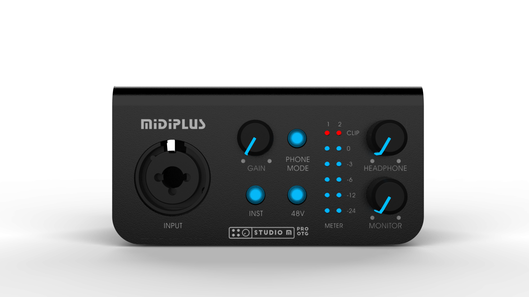 Midiplus Studio M Pro OTG это 1x2 аудиоинтерфейс, отличающийся стильным, лаконичным внешним видом, красивыми световыми индикаторами и одним высококачественными микрофонными предусилителем с фантомным питанием 48V, поддержкой высокого разрешения звука до 24 бит/192 кГц, прямым мониторингом, высокоскоростным USB. 2.0 (совместим с USB 3.0), который идеально подходит для операционных систем Mac и Windows, а также встроенным портом OTG и разъемом для телефона 3.5 мм, который обеспечивает более быструю и удобную on-line трансляцию и передачу аудиосигнала в реальном времени.