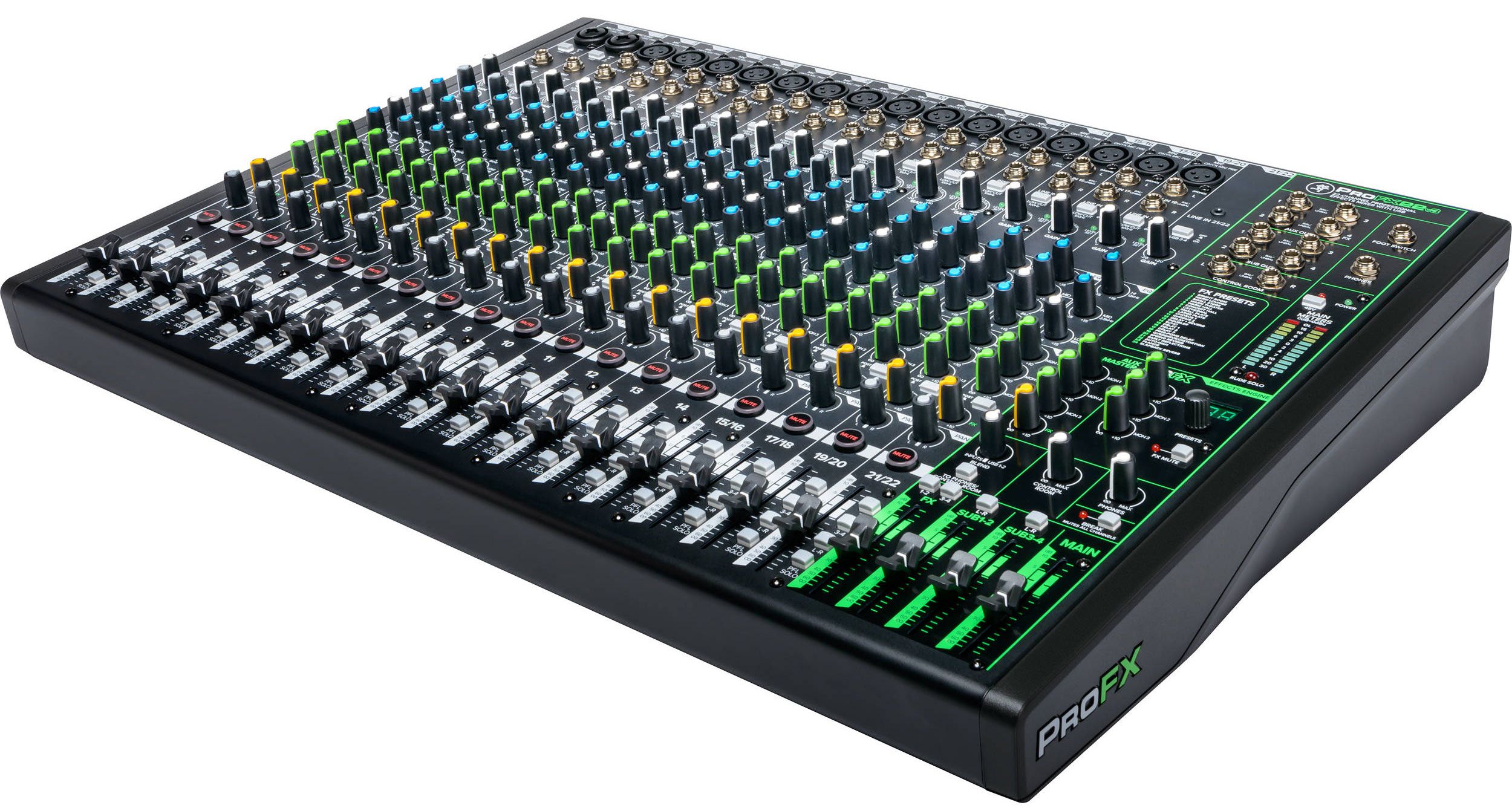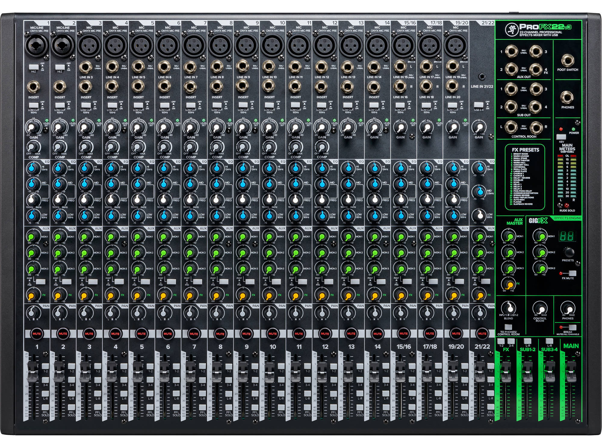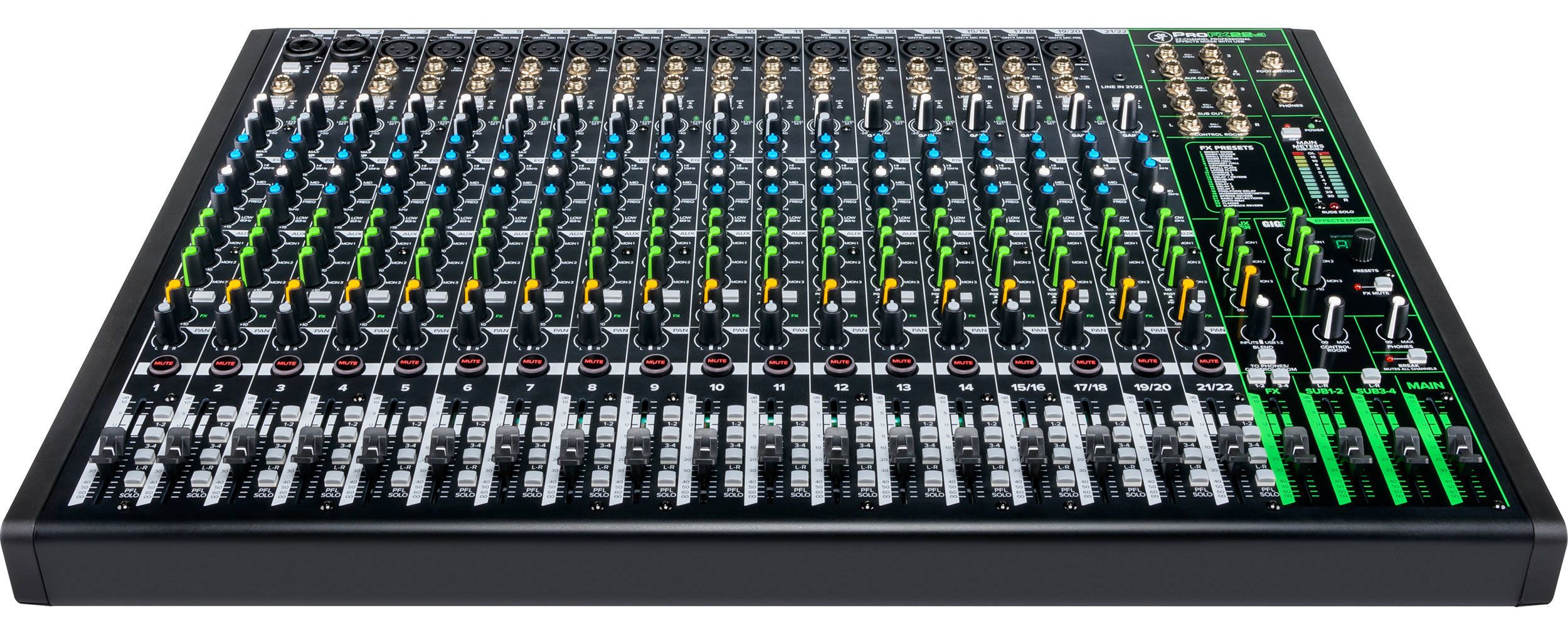 Mackie ProFX22v3 – это аналоговый микшерный пульт, оборудованный USB-аудиоинтерфейсом и DSP-процессором эффектов. Прибор относится к третьему поколению линейке профессиональных микшеров ProFX и является средней моделью в серии, оснащенной 22 входными каналами, которые представляют собой 14 монофонических и 8 стереофонических канала. Микшер отлично подойдет для работы в театрах и домах культуры, школах и университетах, репетиционных базах и студиях звукозаписи.