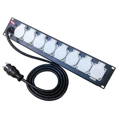 Коммутация: питание осуществляется через встроенную на передней панели вилку PCE Schuko 16A и 2х-метровый кабель H07RN-F 3G2,5 (длина кабеля может быть изменена под индивидуальный размер), выход через 8 розеток Schuko16A с заземлением и защитными крышками.